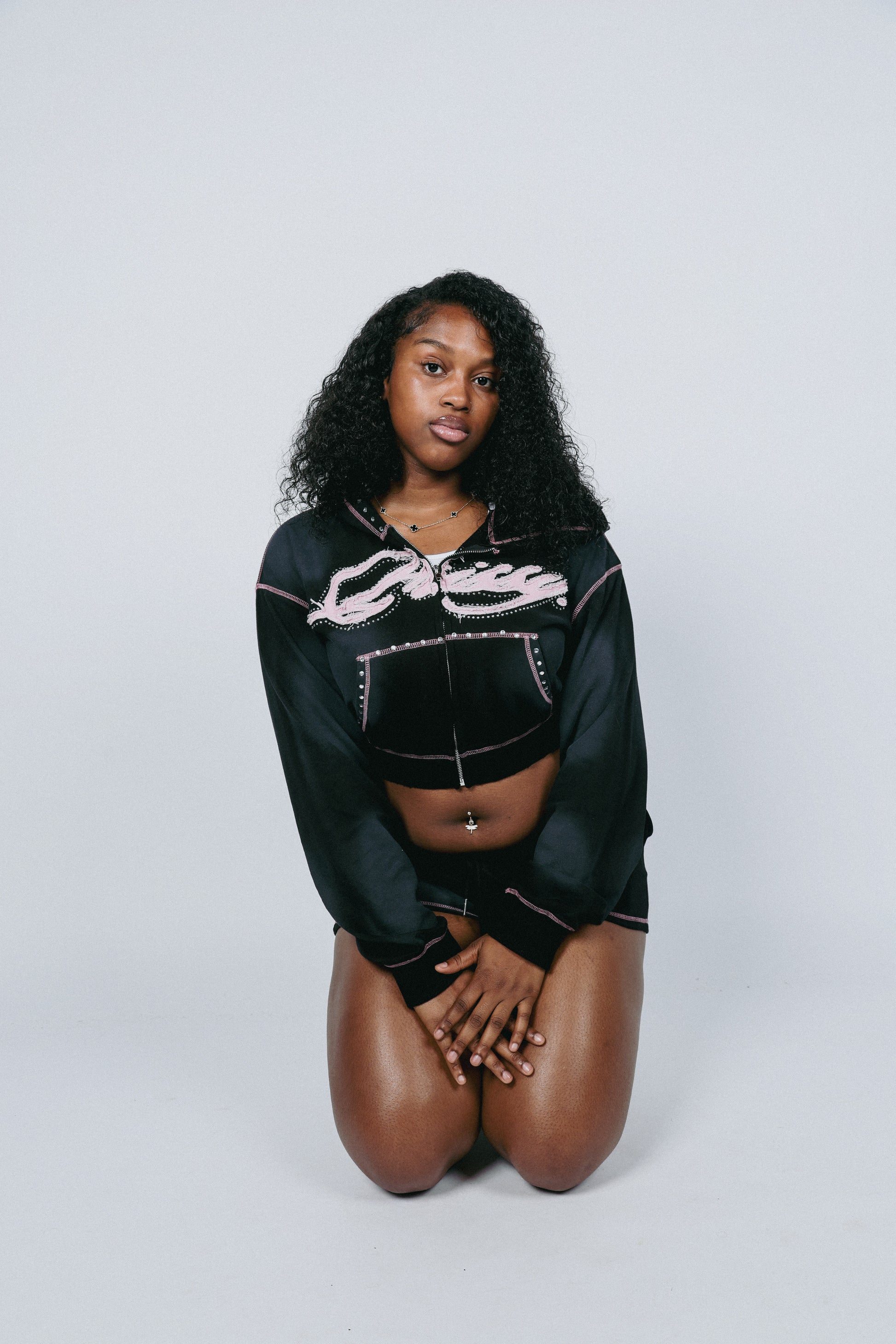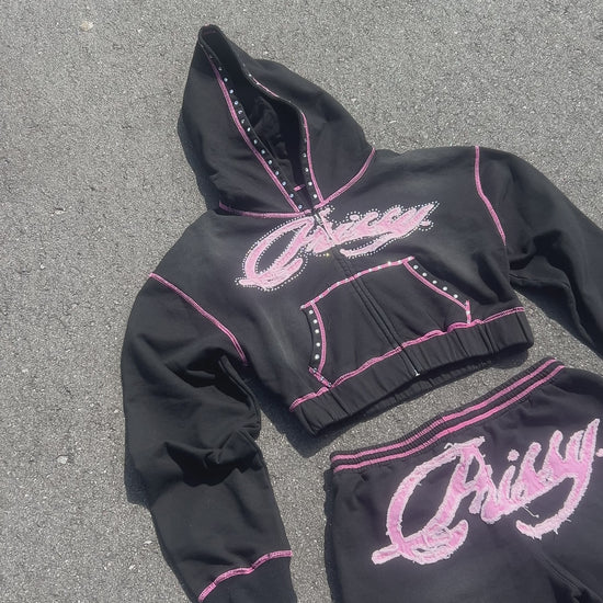 Experience the ultimate level of luxury with our Black and Pink Cross-Stitched/Blinged Out PRISSY Set. This set features sparkling rhinestones and slight drop shoulders, while the oversized fitting provides a comfortable and consistent sizing. Also, pink detailing throughout the entire set!
